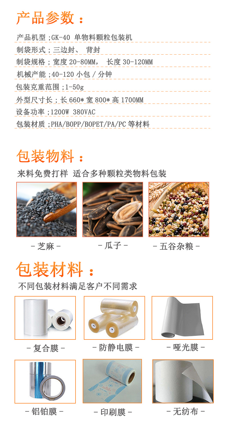 廣泛適用于食品類、五金類、農產品類、日化類、醫藥類等多個行業領域的顆粒類、不規則類產品的包裝
