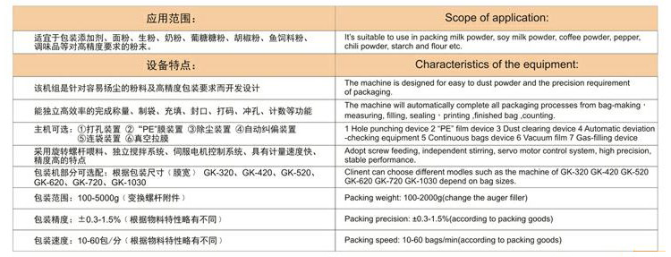 自動完成制袋,計量,下料,封合,分切,計數等功能,適用粉末物料的自動計量包裝機。