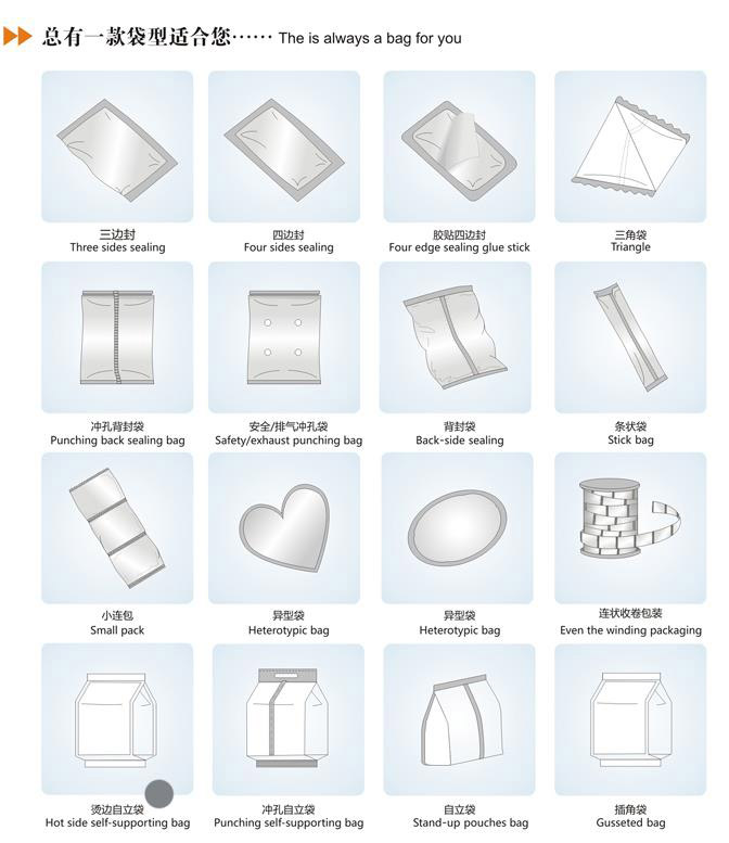 8、包裝的款式多樣化,背封、插角、四邊燙、四邊封、站立袋、連袋、沖孔等。